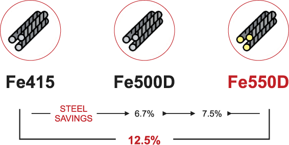 D-grade steel is more frequently utilised in earthquake-prone locations because of how robust it is to seismic activities. According to IS 1786, Fe 550D complies with the chemical requirements with low Carbon, Sulphur, and Phosphorus that enable TMT to gain more ductility that helps the steel to be preserved and resistant to seismic shocks.